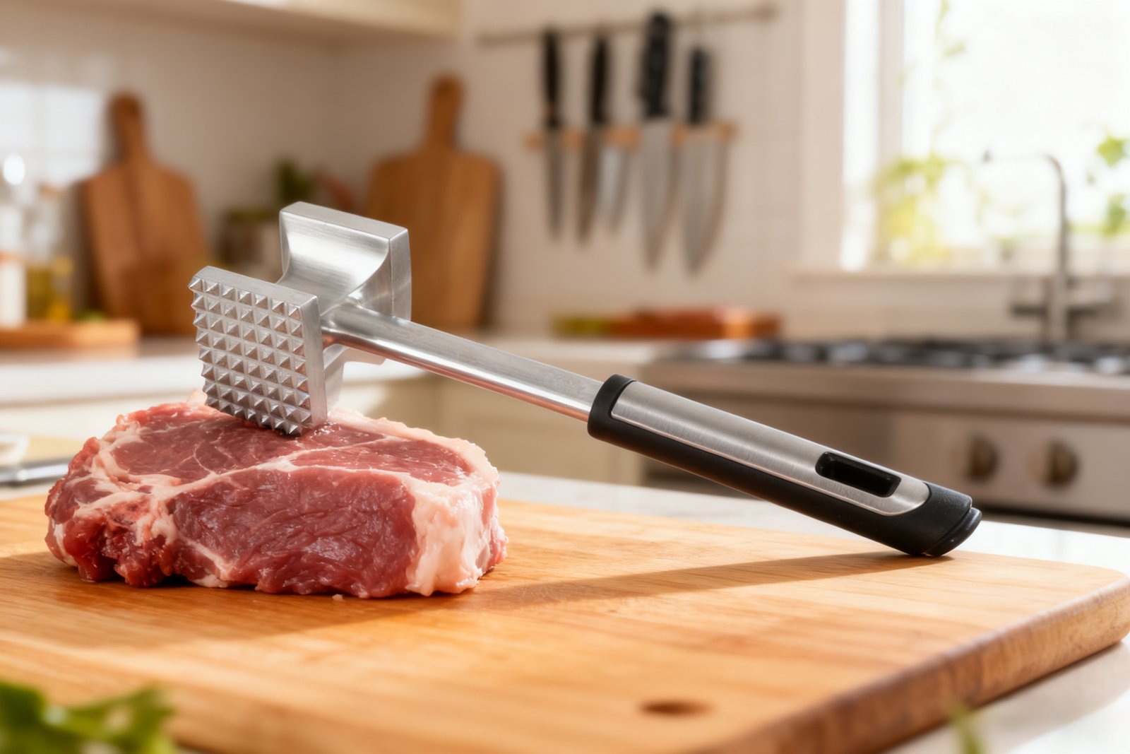- Dual-Sided Hammer Head: Textured side for breaking fibers and increasing softness; flat side for pounding and tenderizing