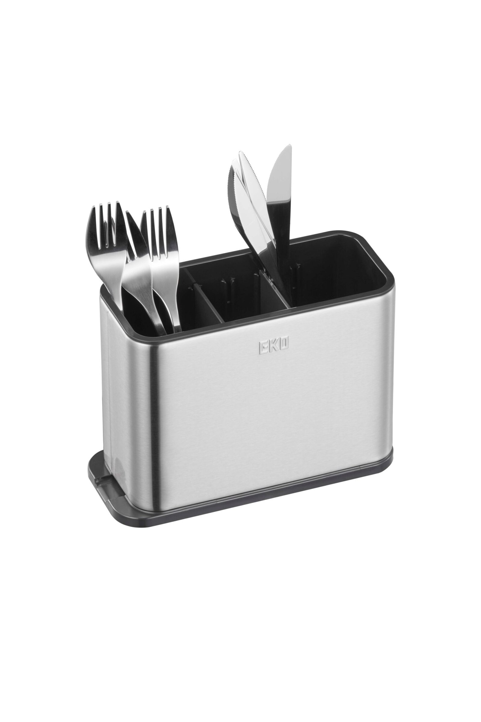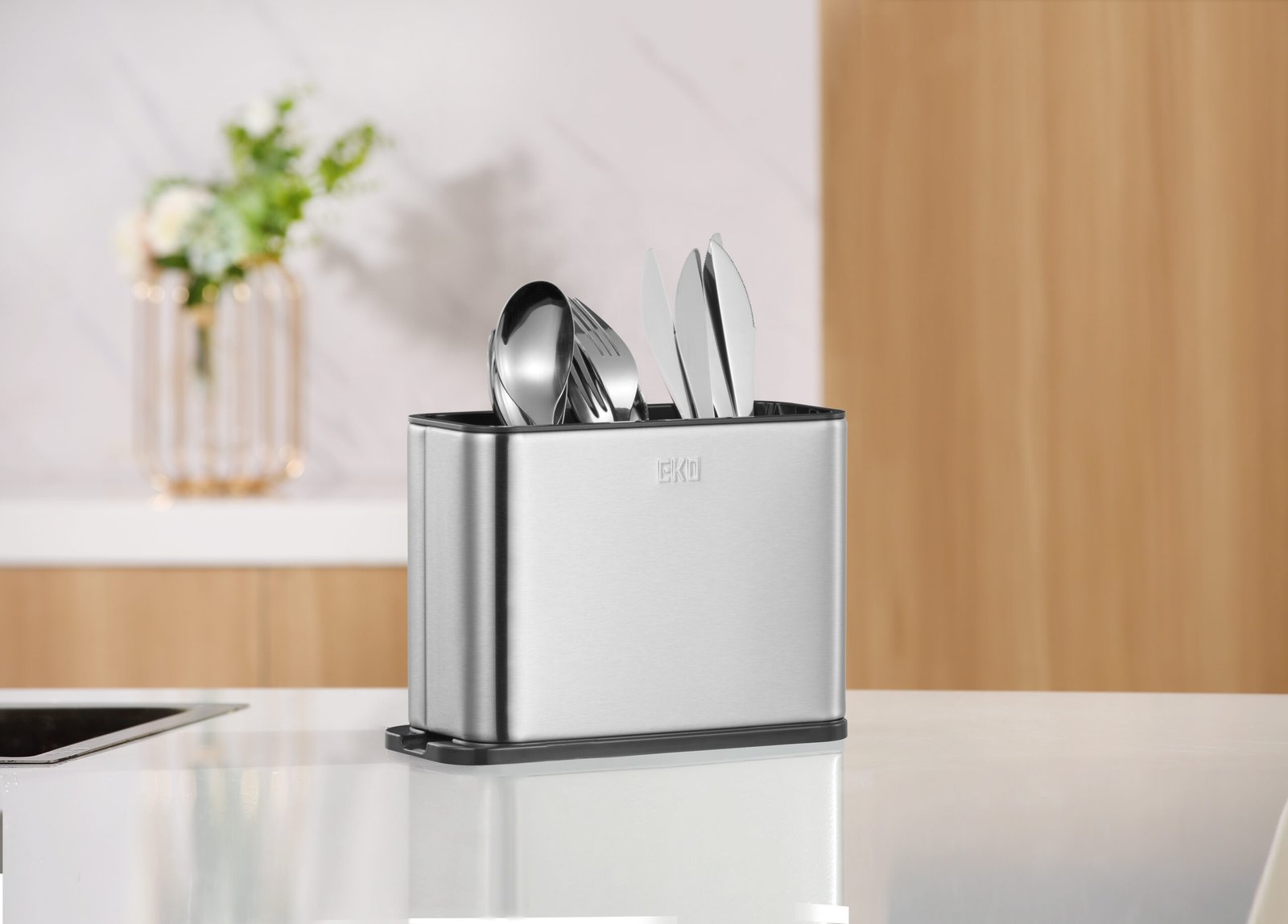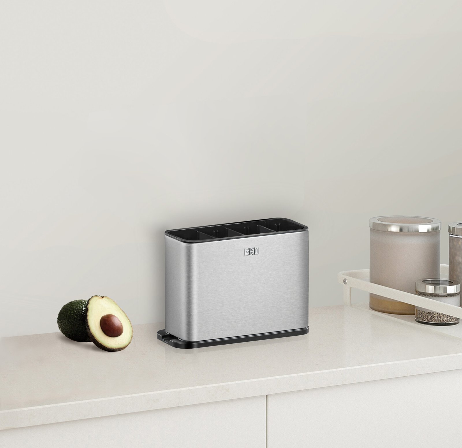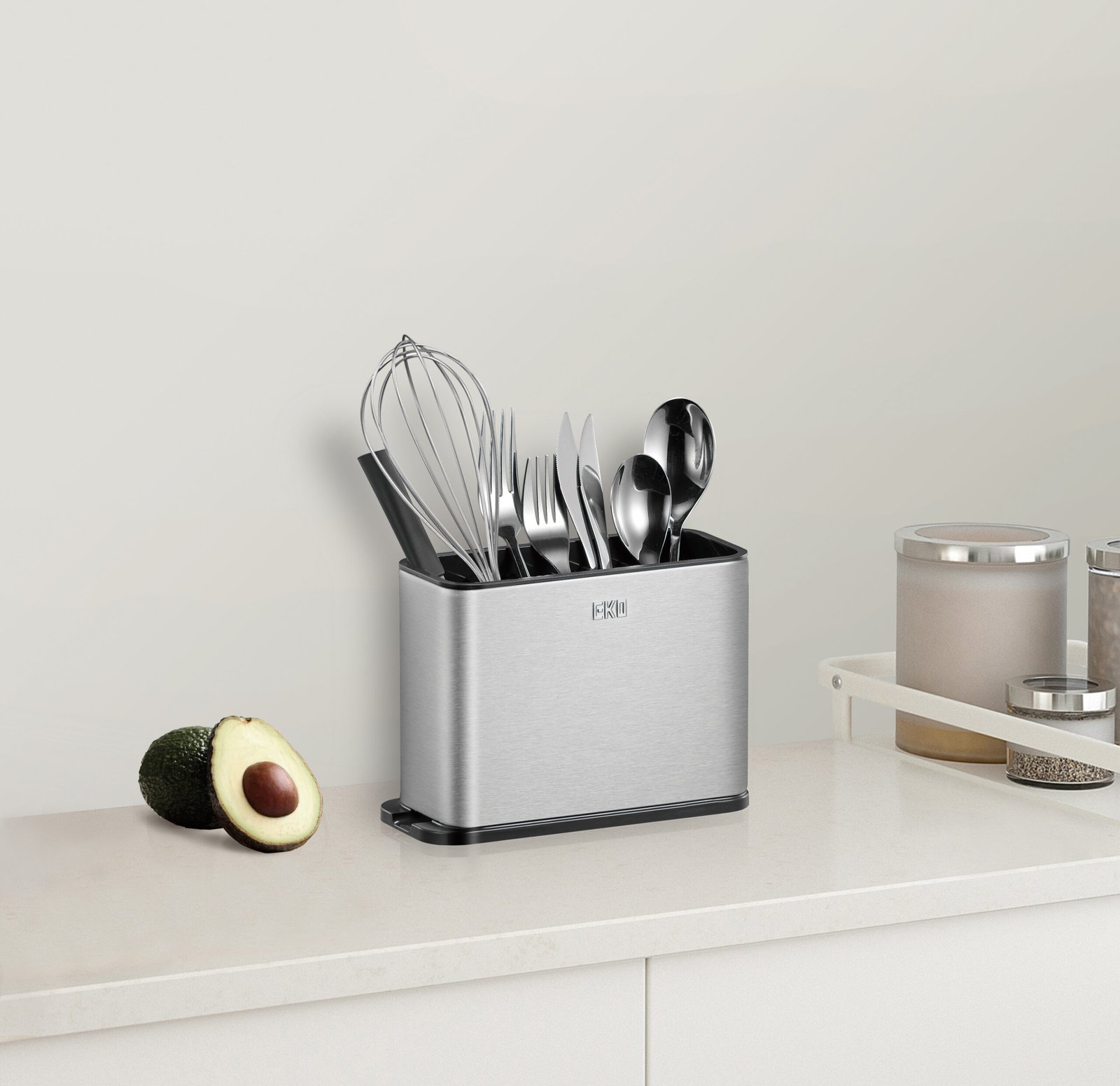 - constructed with a brushed, fingerprint-resistant stainless steel exterior that improves durability and gives your kitchen a sleek, contemporary appearance, making it ideal for countertop utensil storage.