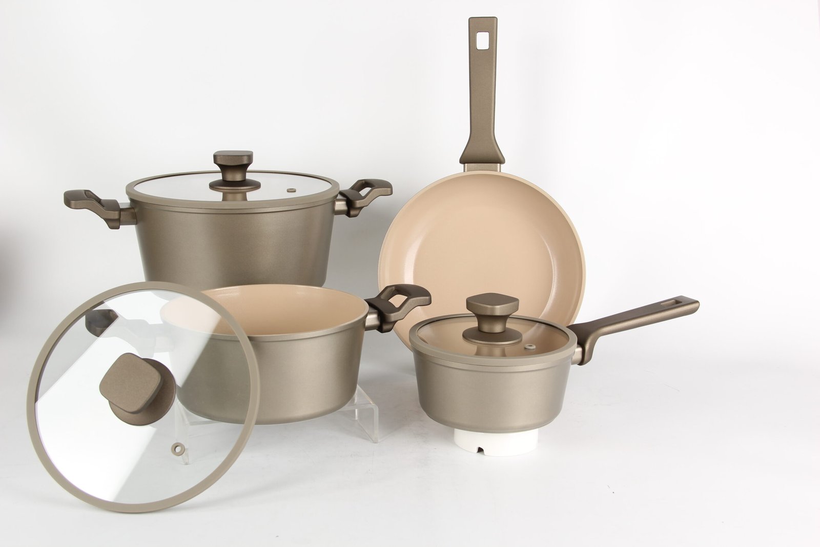- This aluminum cookware set is made up of high-quality aluminum material with a ceramic interior coating.