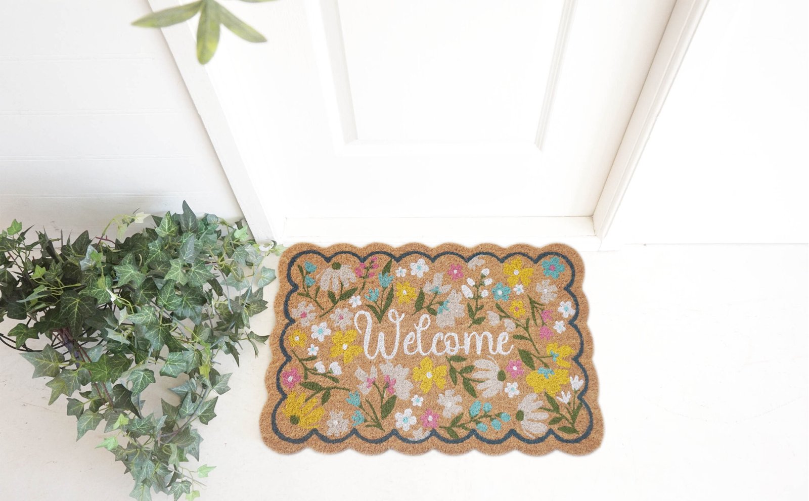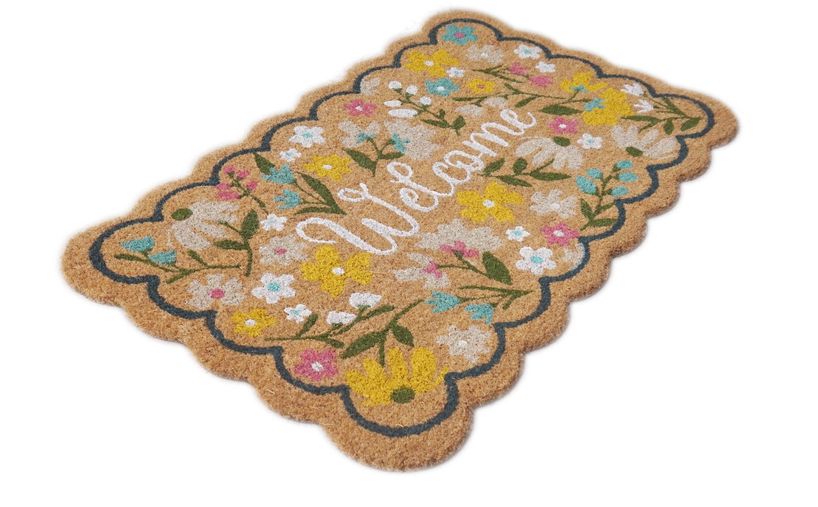 - An eco-friendly coir welcome mat with a delicate glitter accent and a hand-printed orchid design that adds a colorful touch